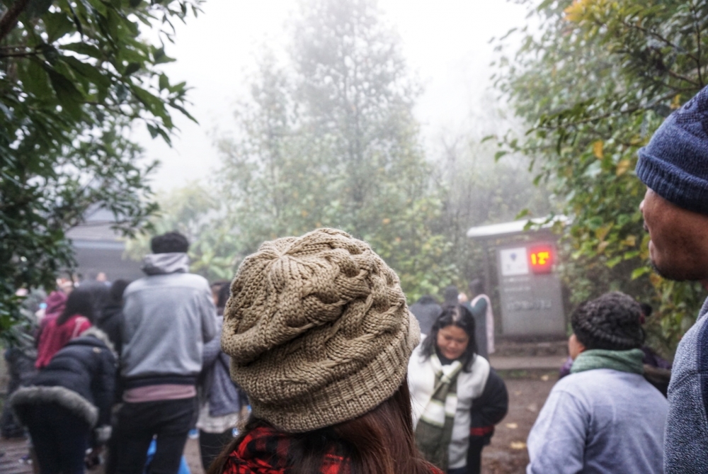 วันนี้โชคไม่ดี ฟ้าไม่เปิด หมอกหนาจนมองไม่เห็นวิว เราไปต่อแถวเข้าคิวเดินกิ่วมาปาน ไม่ถึงครึ่งชั่วโมงก็ถึงคิวเราแล้ว