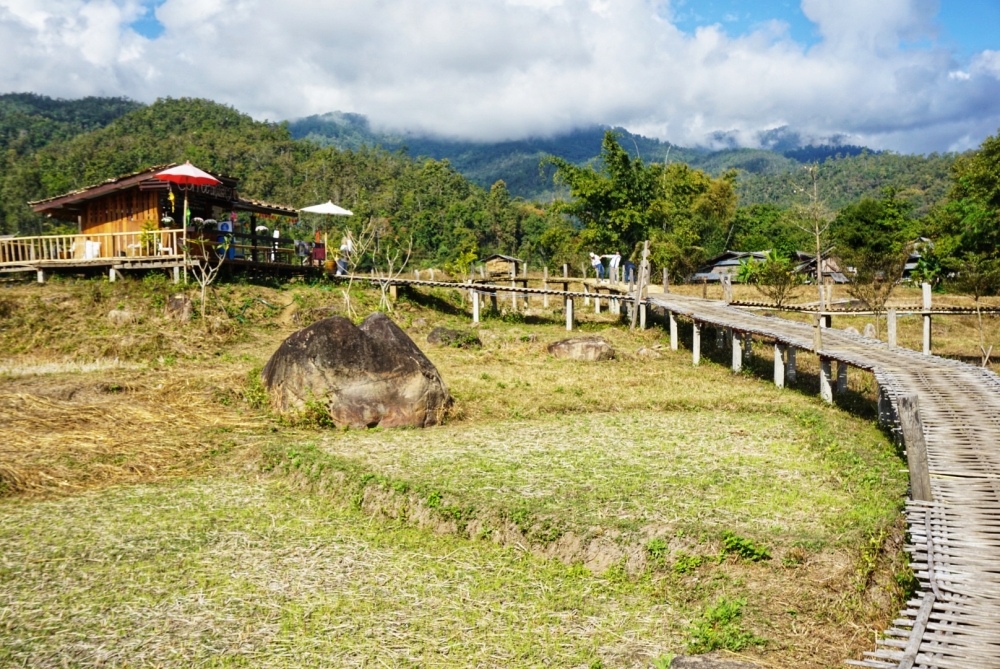 ทางไปจะค่อยข้างขรุขระนิดหน่อย มีโค้งเดียวที่ชัน ที่นี่มีร้านกาแฟด้วย ตอนเราเลยฤดูเก็บเกี่ยวไปแล้ว เลยเห็นแต่ต้นข้าวแห้งๆ