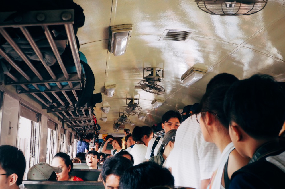 รถบัสที่ขึ้นคนก็เยอะไม่แพ้บนรถไฟเลย ครึกครื้นกันเลยทีเดียว