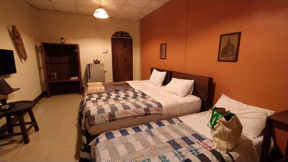 ที่บ้านริมโขงรีสอร์ท เจ้าของใจดี๋ใจดี โทรปุ๊บ ไม่ต้องขอต่อรองอะไร ลดให้ทันที บ้าน 1 หลัง คืนละ 1,000 บาท เตรียมที่นอน หมอน ผ้าห่มให้เป็นอย่างดี แถมยังโทรมาบอก ห้องอาจจะไม่สบายหน่อยนะ เพราะมีว่างอยู่ห้องเดียว จะอยู่กันได้ไหม แต่เดอะแก๊งฯ สบายมาก ขอแค่มีที่ซุกหัว และหลบอากาศที่หนาวเย็นก็ดีถมไปแล้ว ดีกว่าที่เราต้องไปนอนเต็นท์ท่ามกลางอากาศที่เริ่มเย็นลง กับอุณหภูมิ 21 - 24 องศา