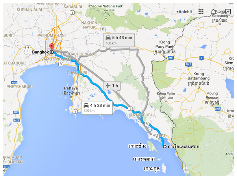 แค่นั้นแหละเรียบร้อยทุกอย่างเชื่อผมสิ! ต่อมาหารถไปตราด ถ้าอยากชิลก็นั่งรถทัวร์จากสถานีเอกมัย ใครมีอคติกับเจ๊เกียวให้โยนทิ้งไปก่อนเพราะคราวนี้ต้องพึ่งพาเชิดชัยทัวร์ ไปให้ทันรถเที่ยวแรกตีห้าจะชัวร์สุด หากเป็นเที่ยวหกโมงเช้าอาจต้องตาลีตาเหลือก เพราะใช้เวลาเดินทางตั้งห้าชั่วโมงจึงถึงตัวเมืองตราด ถ้าอยากไปแบบสปีดเร็วกว่านรกต้องนั่งจรวด ฐานปล่อยจรวดอยู่แถวอนุสาวรีย์ชัยสมรภูมิ เป็นจรวดสี่เหลี่ยม 14 ที่นั่ง บอกเขาเลยนะครับว่าลงตัวเมืองตราด เพราะจรวดไปเกาะช้างบางลำไม่เข้าตัวเมือง