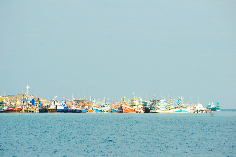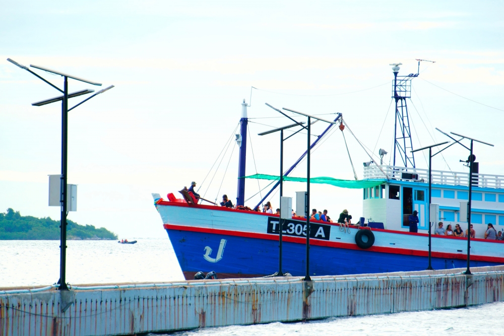 เมื่อเดินทางมาถึงแล้ว จอดรถไว้เท่ๆ เดินไปที่ขายตั๋วเพื่อต่อคิวซื้อตั๋ว ส่วนใครที่จองมาแล้ว เดินเชิดหน้าสวยๆ แล้วก็รับตั๋วได้เลย ไม่ต้องต่อคิวกับใครใดๆ ทั้งสิ้น รอรถสองแถวมารับไปยังท่าเรือ (ตรงนี้หากใครไม่อยากรวมกลุ่มกับนักท่องเที่ยวคนอื่น ก็สามารถขับรถเข้าไปจอดใกล้ๆ กับท่าเรือได้เลย) ที่ตั๋วจะระบุหมายเลขไว้ เพื่อทำการต่อคิวขึ้นเรือนะจ๊ะ นางจะเรียกเป็นรอบๆ ทีละคิวให้มาต่อแถวตากแดดให้ดากดำ (กลางแดดจ้าจริงๆ) ใช้เวลาจากท่าเรือไปยังเกาะประมาณ 45 นาที โดยทุกครั้งที่นั่งเรือต้องสวมเสื้อชูชีพตลอดเวลาเพื่อความปลอดภัย พอมาถึงหน้าหาดของเกาะขาม เราต้องย้ายจากเรือลำใหญ่ไปลงเรือลำเล็กเพื่อขึ้นฝั่ง (เออ ค่าเรือคุ้มละ ฮาๆๆๆๆๆๆ)