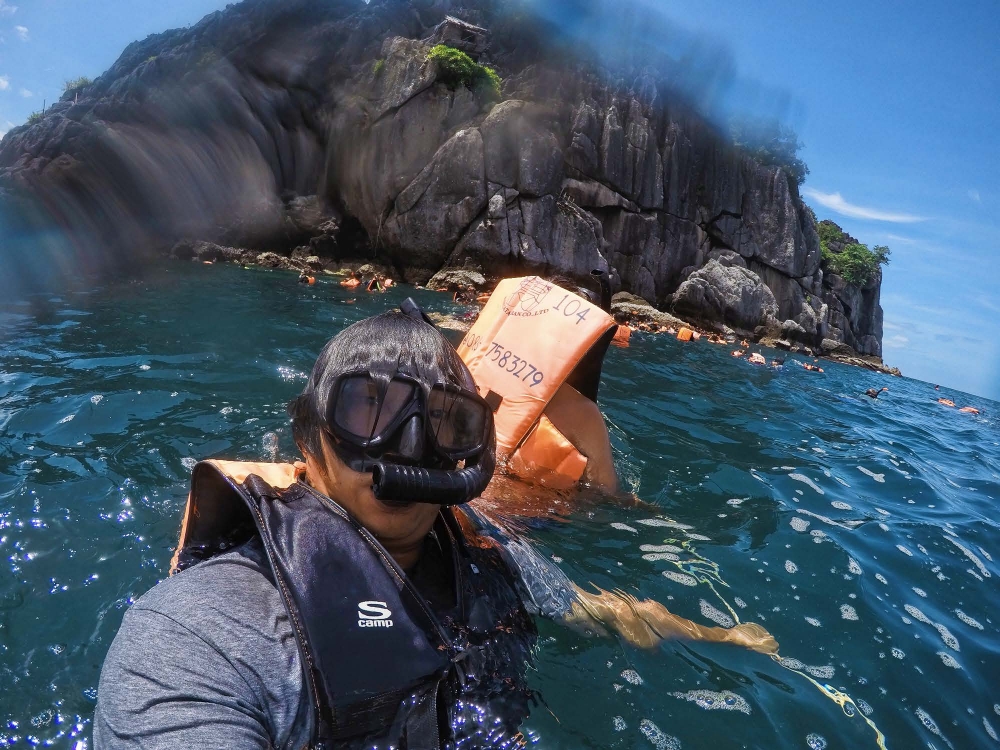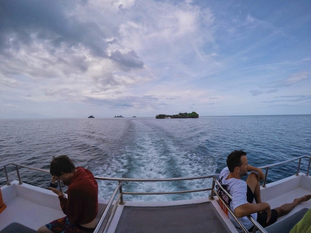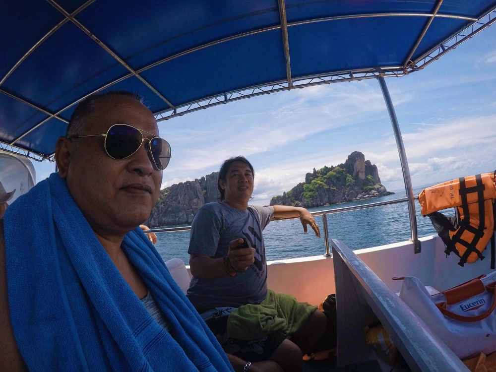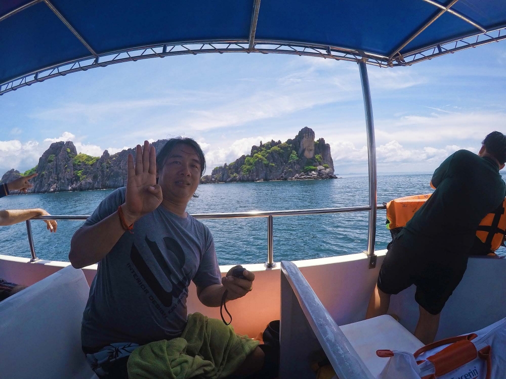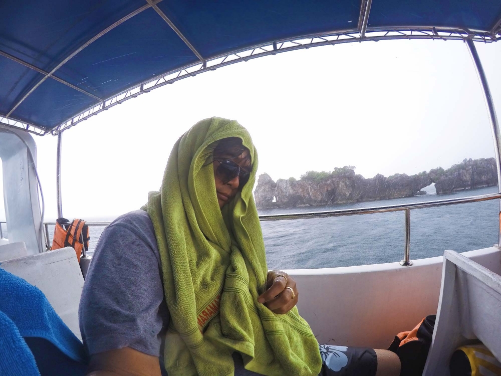 เอาแล้วข้างหน้ามันเมฆฝนนี่น่า ไหนๆก็เปียกอยู่แล้ว กลัวไร 55 วนรอบเกาะหาที่จอดหลบลมแป็บ รอฝนผ่านไป วนไปหน้าเกาะใหม่ จอดเรือ ลงน้ำจร้า ล้างน้ำฝน 55