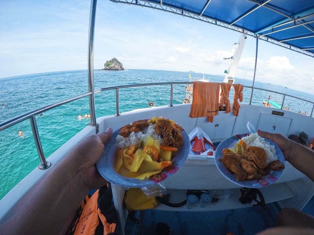 ดอกไม้ทะเลเยอะมากกกก ปลาก็เยอะ พริ้วไหวสวยงาม ดูจนอิ่ม ตอนนี้ท้องร้องแระ ได้เวลากินข้าพอดี ขึ้นเรือไปหาข้าวดีกว่า เป็นแบบบุฟเฟ่ อร่อยใช้ได้