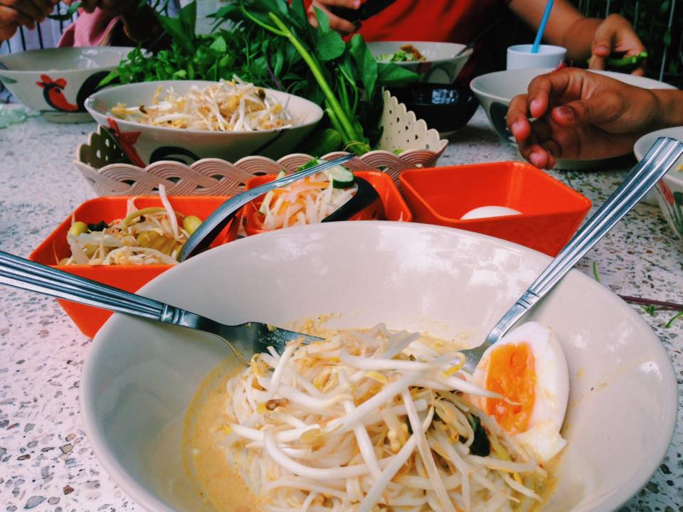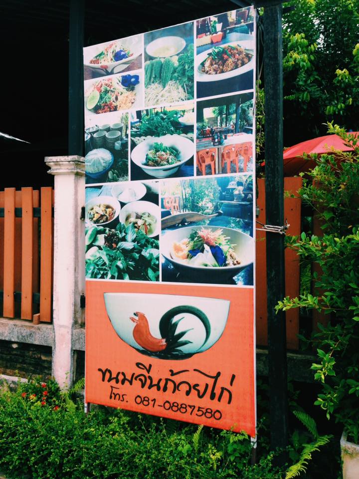 แล้วเราก็แวะมากินขนมจีนกับข้าวยำบูดูที่ร้านนี้กัน ชื่อร้านว่า ‘ขนมจีนถ้วยไก่’