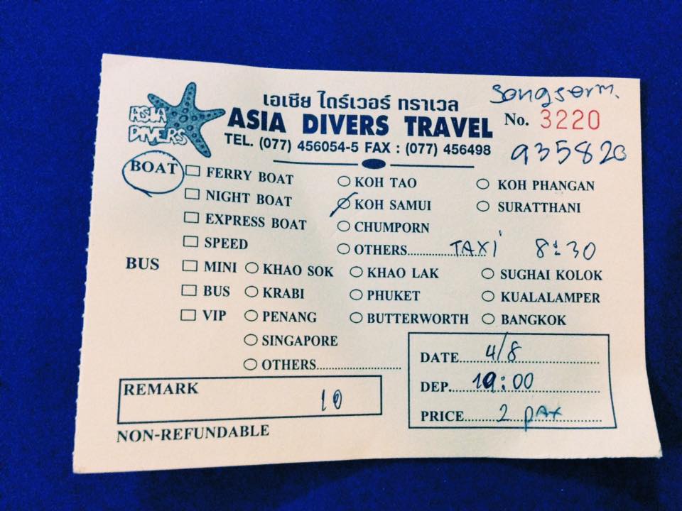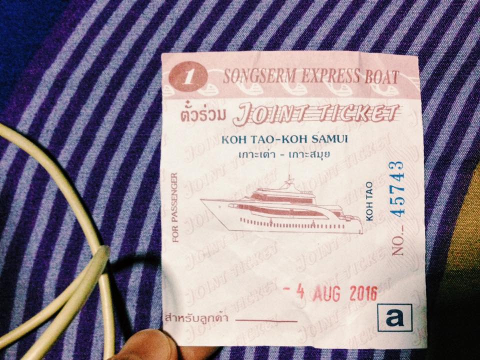 ตอนประมาณ 8 โมงเช้า เราก็ check-out จากที่พัก แล้วซื้อตั๋วเรือไปเกาะสมุยกับที่พักเลย ค่าเรือคนละ 470 บาท