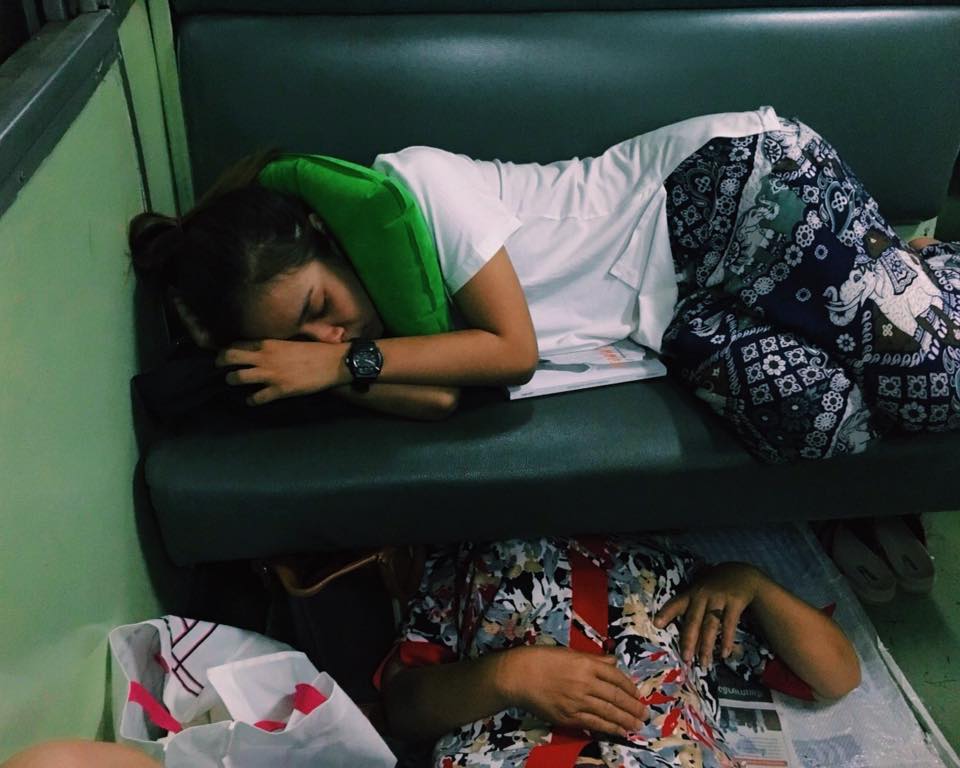 พอดึกๆ ป้าที่นั่งด้วยกับเราก็ลุกไปนอนตรงพื้นข้างล่าง ป้าเค้าบอกไว้ก่อนว่าคนใต้มักจะชอบนอนพื้นข้างล่างเวลานั่งรถไฟ เพราะมันสบายกว่านอนข้างบน (ใครไม่รู้มาก่อนอาจจะตกใจได้ถ้าเจอแบบนี้)