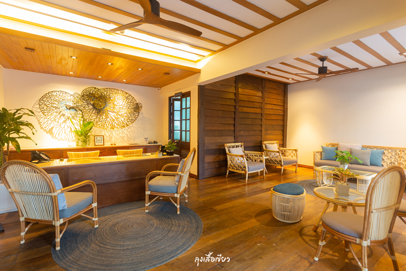 เมื่อก้าวเท้าผ่านซุ้มประตูไม้เข้าไป ด้านซ้ายมือจะเป็นส่วนของลอบบี้ ที่เปิดโล่งรับลมธรรมชาติ การตกแต่งเน้นโทนสีน้ำตาล เฟอร์นิเจอร์เป็นไม้และหวายครับ