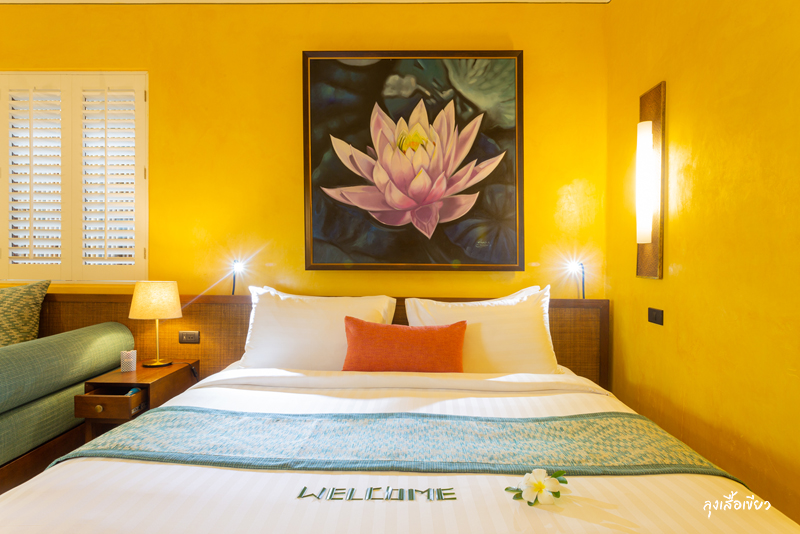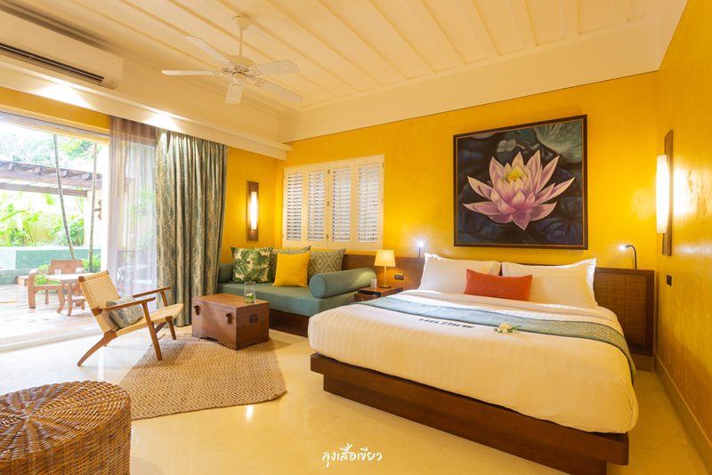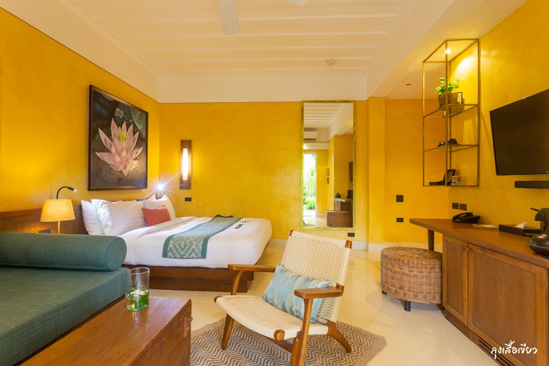 ในห้องพักตกแต่งด้วยโทนสีเหลืองและสีน้ำตาล เตียง King size พร้อมหมอนที่หนานุ่ม ด้านข้างเตียงมีมุมให้นั่งพักผ่อน โดยมีโซฟาและเก้าอี้ให้นั่งพักผ่อนครับ