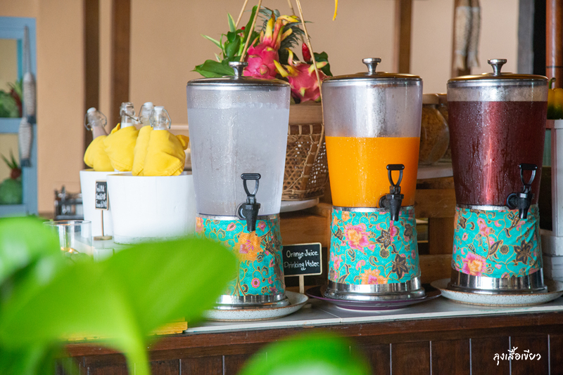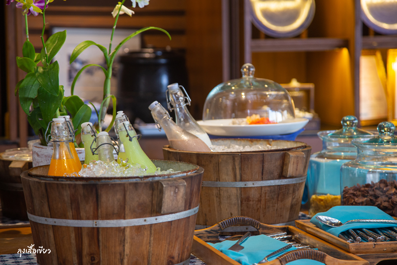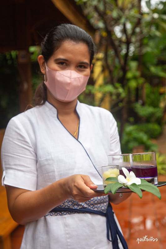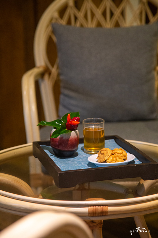 พนักงานต้อนรับนำ Welcome Drink มาเสิร์ฟ Welcome Drink เป็นน้ำอัญชันมะนาว โดยแยกมาเป็นน้ำอัญชันและน้ำมะนาวแช่แข็งเป็นก้อนเล็กๆ เมื่อใส่ก้อนมะนาวในน้ำอัญชัน น้ำอัญชันก็จะเปลี่ยนสี แถมมีรสชาติเปรี้ยวขึ้นมาจากเดิม เรียกความสดชื่นได้ดีเลยทีเดียวครับ