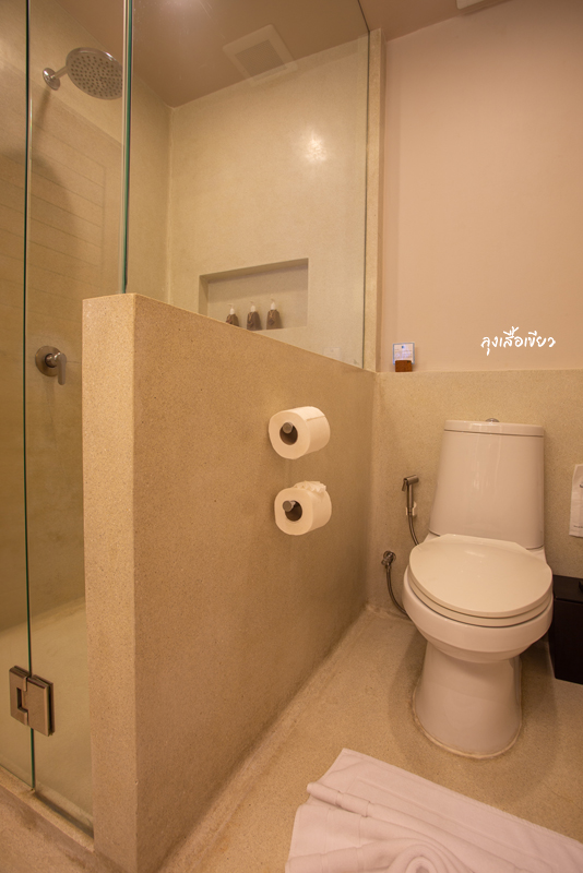 ห้องน้ำค่อนข้างกว้างขวางเลยทีเดียว แยกส่วนเปียกส่วนแห้งอย่างชัดเจน มีสายฉีดชำระให้พร้อม ฝักบัวแบบ Rain Shower มียาสระผมพร้อมครีมอาบน้ำกลิ่นมะพร้าวหอมๆ เหมือนที่เกาะสมุยครับ