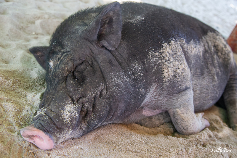 เดิมทีเดียว มีชาวบ้านพาน้องหมูขึ้นเรือข้ามมายังเกาะแห่งนี้ พอนักท่องเที่ยวเห็น ก็คอยให้อาหาร จนน้องหมูอ้วนถ้วนสมบูรณ์ ออกลูกออกหลาน เดินกันทั่วทั้งชายหาด ใครที่อยากได้ภาพน้องหมูเดินริมชายหาด อาจจะต้องมาในช่วงแดดร่มลมตกนะครับ เพราะช่วงแดดแรงๆ คนยังต้องหลบแดด น้องหมูก็เช่นกัน นอนหลับอุตุอยู่ใต้ร่มไม้เย็นสบายกว่าเยอะ น้องหมูที่นี่คุ้นเคยกับคนเป็นอย่างดีครับ แต่มีคำเตือนว่าอย่าไปจับบริเวณหน้าของมัน เพราะมันอาจจะแว้งกัดเอาได้ กันไว้ดีกว่าแก้ครับ