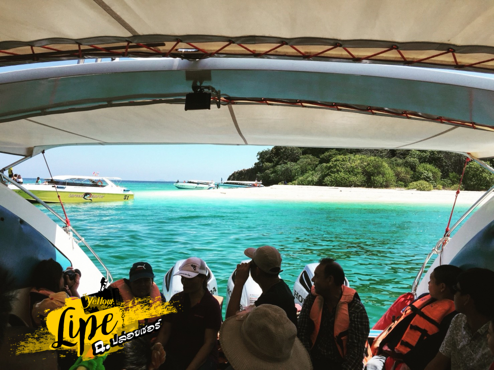 นั่นไงล่ะ สปีดโบ๊ตกำลังพาเราเข้าใกล้เกาะตรงหน้า ผ่านโป๊ะกลางทะเลที่มีไว้สำหรับเฟอรี่ถ่ายคนเพื่อลงและขึ้นเกาะ นั่นเองเกาะที่มีสิ่งปลูกสร้างเพิ่มขึ้นอยู่เรื่อยๆนั้น ในตอนนี้ยังแสนสวยงาม ทะเลสีเขียวเข้มได้เปลี่ยนสีอ่อนเมื่อเข้าใกล้หาดขึ้นเรื่อยๆ ใส...ใสมากจริงๆ หากเรือหยุดนิ่งตรงไหนสักที่คงบอกได้ว่าความใสที่เห็นทะลุไปยังผืนทรายขาวเนียนขนาดนี้ไม่ต่างอะไรกับกระจกเลยทีเดียว