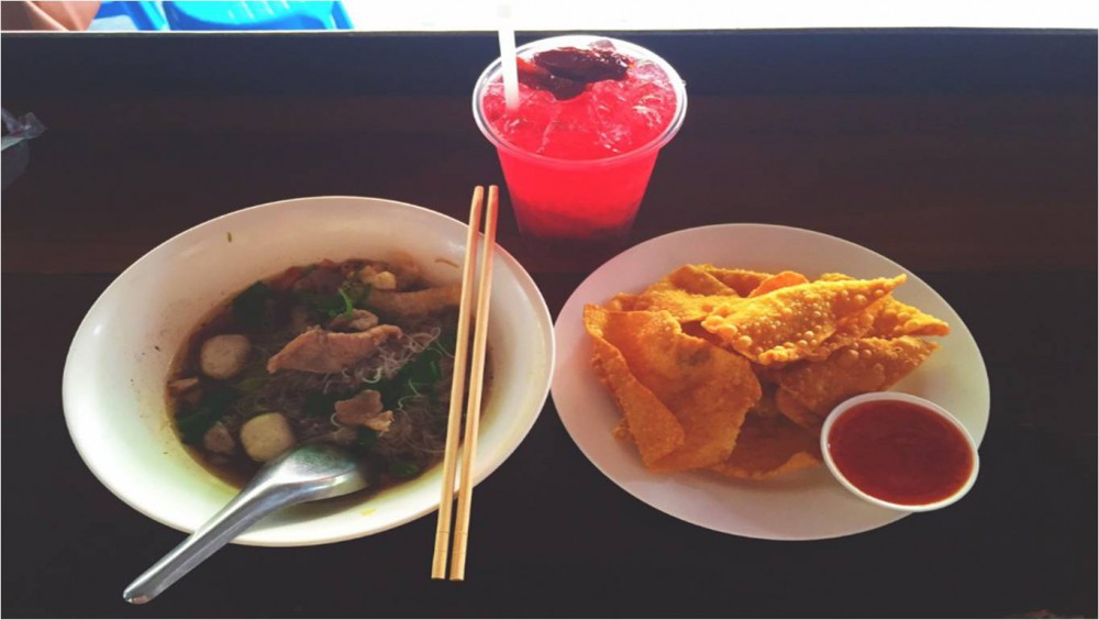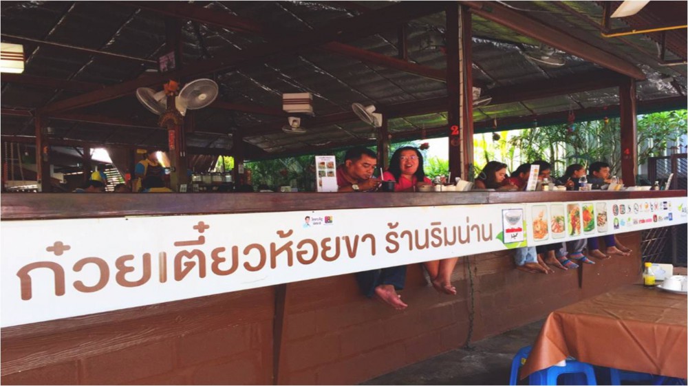 ไหว้พระเสร็จ...เราก็เดินไปลิ้มรสก๋วยเตี๋ยวห้อยขา ร้านอาหารเรื่องชื่อของจ.พิษณุโลก อยากรู้เหมือนกันว่ารสชาติจะเด็ดขนาดไหน ระยะทางในการเดินไปร้านก๋วยเตี๋ยวไม่ไกลจากวัดใหญ่ค่ะ หากคาดคะเนคิดว่าระยะทางน่าจะประมาณ 600 เมตรได้ เมื่อมาถึงก็ไม่รอช้าค่ะ สั่งอาหารกันดีกว่า เกี๋ยวเตี๋ยวที่เราสั่งคือ ก๋วยเตี๋ยวหมูน้ำตก แผ่นเกี๊ยวทอด และน้ำกระเจี๊ยบพุทรา เรื่องรสชาติของก๋วยเตี๋ยว เป็นรสกลางๆ คนไทยทานได้ฝรั่งทานดี รสชาติไม่หนักมาก...และเราสามารถเพิ่มรสชาติความจัดจ้านได้ด้วยเครื่องปรุงรสค่ะ