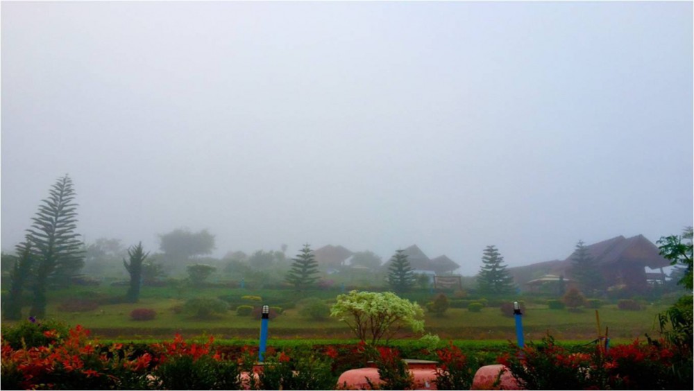 ฟ้าค่อยๆสว่างหยด น้ำเล็กๆ ร่วงหล่นลงดวงตาข้างหนึ่งพลันให้เราต้องลุกออกจากที่นอน ตืนได้ก็รีบวิ่งไปอาบน้ำล้างหน้าเเต่งตัว เพื่อไปเดินดูสายหมอกสีขาวปกคลุมไปทั่วรีสอร์ทแห่งนี้หนาวจับขั้วหัวใจค่ะ หมอกลงหนามากจนท้องฟ้าขาวโพลนไปทั่วทั้งหุบเขา อีกทั้งความหนาและหนักของสายหมอก ทำให้หมอกตกมาเป็นละอองเม็ดเล็กๆ จนพื้นทางเดินชื้นตามไปด้วย