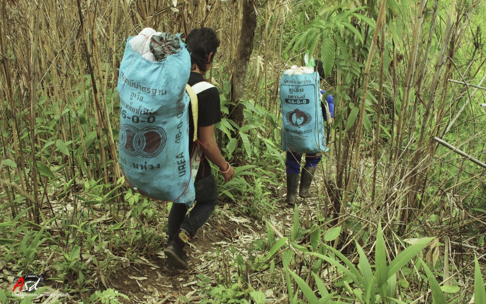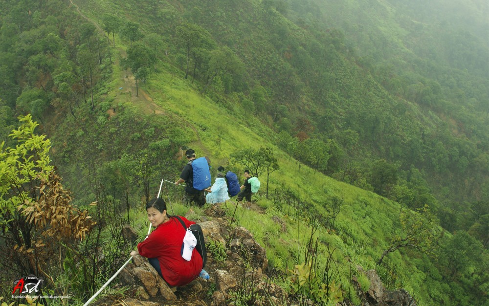 เดินกันมาประมาณเที่ยงกว่าๆ ก็ถึงจุดที่พักกินข้าวกลางวัน แขนขาเริ่มหมดแรง สภาพอากาศก็ร้อนๆ หนาวๆ เหมือนฝนจะตก เราจึงเริ่มออกเดินทางกันต่อ ออกมาได้สักพักฝนก็ตกลงมาหนักช่วงแรก แล้วก็เริ่มปรอยๆ ตลอดทางเดิน เราใช้เวลาเดินสี่ชั่วโมงครึ่งจึงถึงจุดที่พักกางเต้นท์