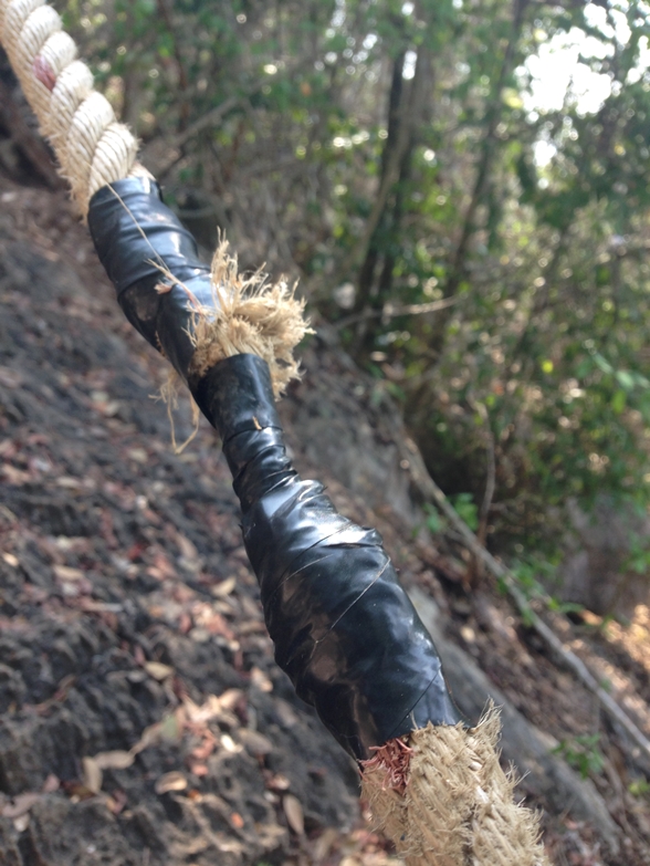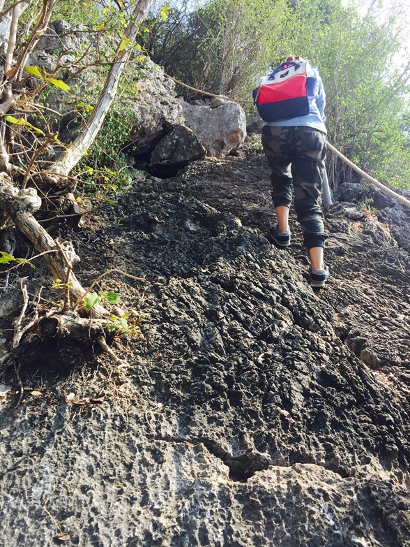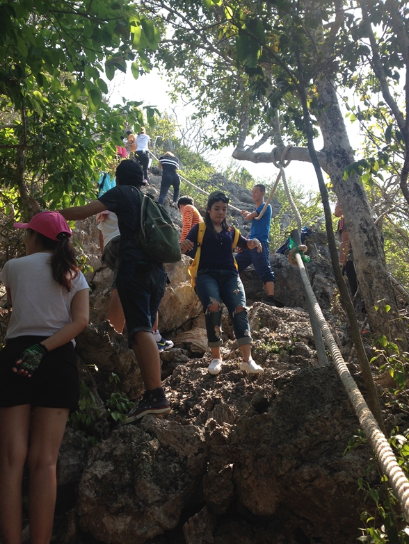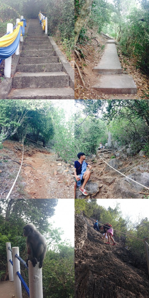 ทางขึ้นจะเป็นบันไดก่อนนะคะ หลังจากนั้นเริ่มเป็นทางดินกับหิน แล้วก็มีแต่หินทั้งนั้นเลย จะมีเชือกให้จับตลอดทางค่ะ และมีทหารคอยดูแลเป็นจุดๆตลอดทางขึ้นเขาค่ะ  ระหว่างทางจะมีค่างแว่นมานั่งรอต้อนรับ
