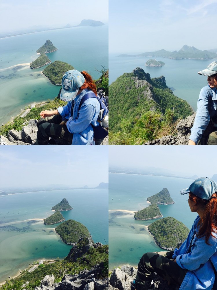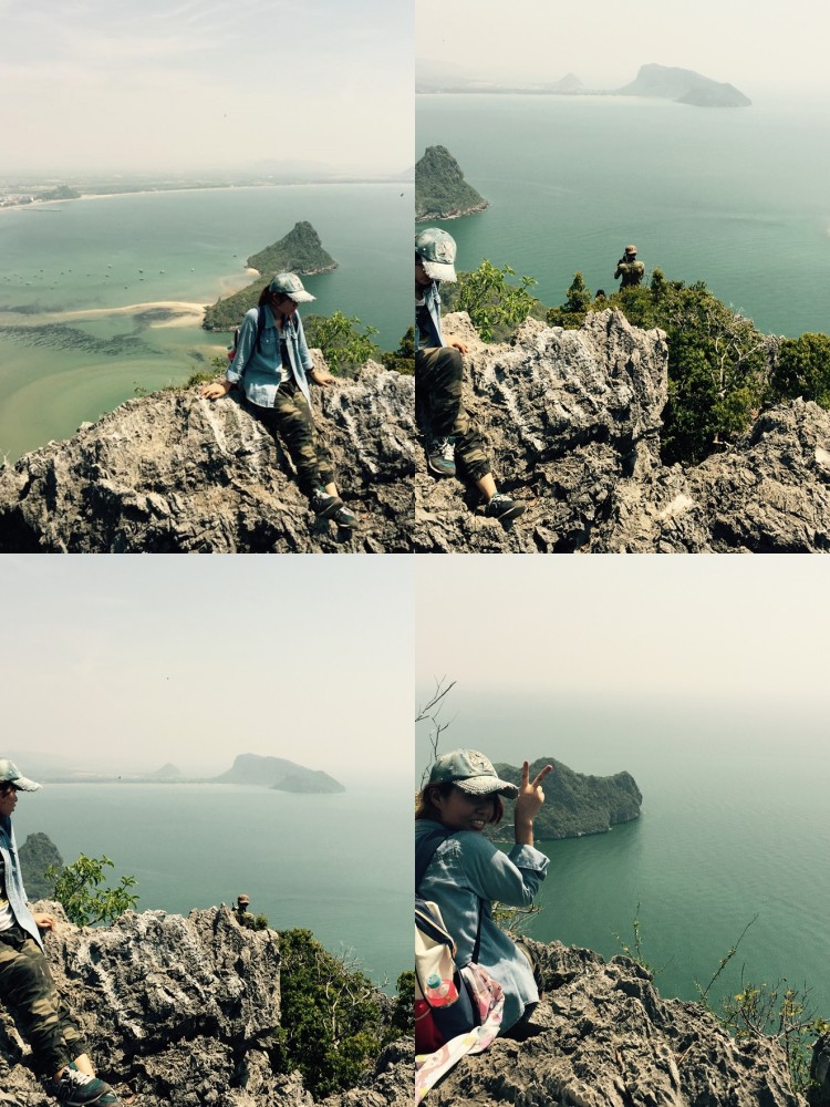 เราขึ้นมาดูวิวที่วัดเขาช่องกระจกค่ะ เป็นบันไดขึ้นไปมีความชันขึ้นไปข้างบนจะมีป้ายเขียนว่า "เมืองสามอ่าว" พอขึ้นไปอยู่ตรงนั่นแล้วถ่ายรูปมาไม่ได้ต้องถ่ายจากข้างล่างขึ้นไป ที่นี่มีเจ้าถิ่นเป็นลิงเยอะแยะไปหมดเลย แต่เราว่าลิงที่นี่น่ารักว่าที่ลพบุรีนะคะเขาจะไม่มายุ่งกับเรา