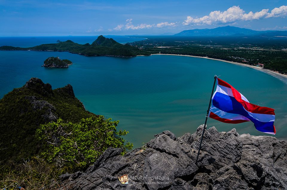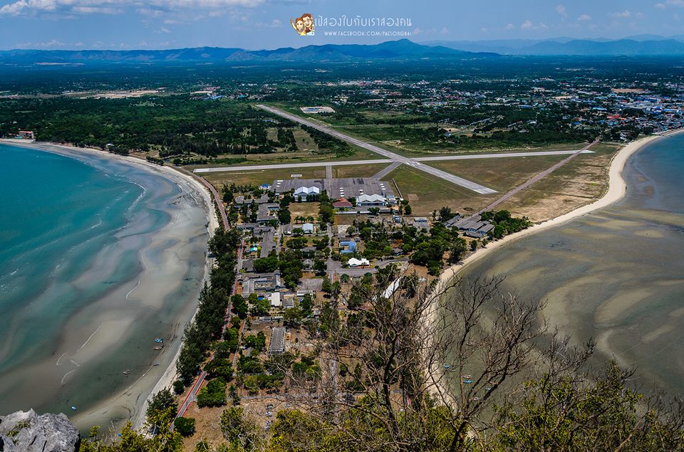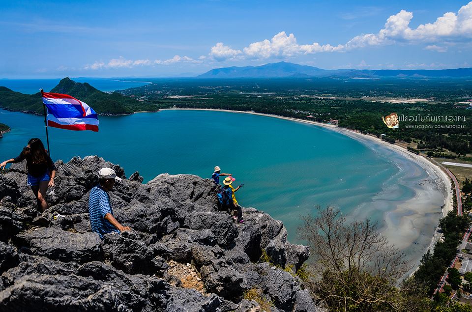 แล้วค่อยนั่งพักสักเล็กน้อยทีนี้ก็จับจองมุมถ่ายภาพได้ตามสะดวก แต่ก็ต้องระวังหน่อย อย่าผาดโผนกันเกินไป อาจจะกลิ้งตกเขาได้ เราสามารถมองเห็นอ่าวได้ทั้งหมด 5 อ่าว ในเมืองประจวบฯ เมื่อหันหน้าเข้าสู่แผ่นดินด้านหน้าจะเป็นกองบิน 5 มองเห็นลานบินตัดกัน