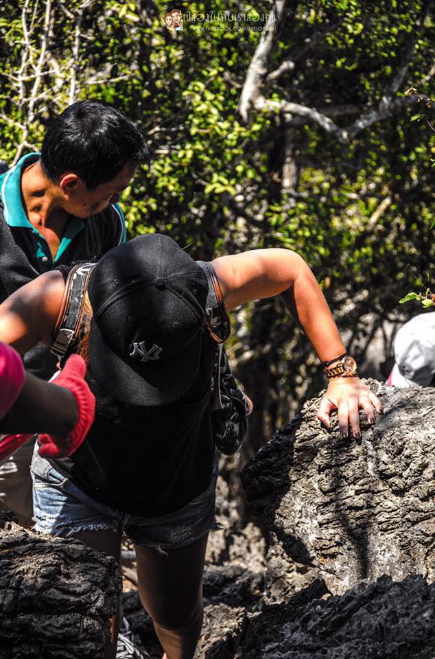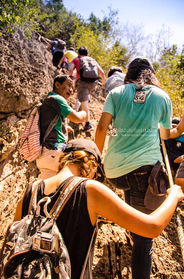 เชือกเส้นใหญ่มัดกับเสาเหล็กดูแข็งแรงแน่นหนาดี มีเจ้าหน้าที่เป็นทหารอากาศมาค่อยอำนวยความสะดวกและค่อยดูแลเป็นระยะๆ การปีนเขาล้อมหมวกถ้าคนไม่เยอะก็จะใช้เวลาอยู่ประมาณ 30 นาที ก็จะถึงยอด ถ้าคนเยอะๆ อย่างที่ผมไปก็เป็นชั่วโมงนะครับ เพราะทางขึ้นลงมันเป็นทางเล็กๆ ทางเดียว ต้องรอคนข้างบนลงมาก่อน