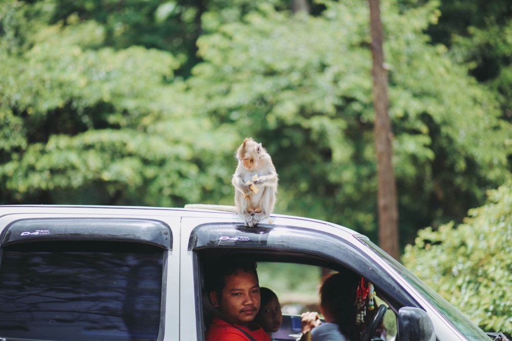 ที่เจ้าถึ่นไม่ต้องบอกว่าเป็นใครยังไง นั่งต้อนรับเราเลยทีเดียว... ที่นี่ลิงจะเยอะมาก ก็จะมีร้านขายขนมเลี้ยงลิง หลายร้าน ด้านที่จอดรถก็จะมีไว้ให้จอดอยู่โดยล้อมรั้วให้อย่างดี