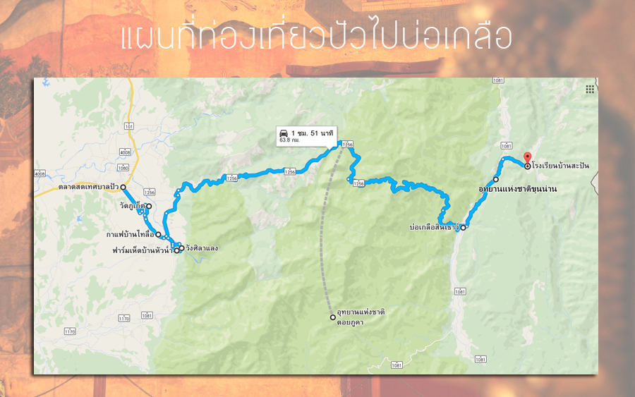 รวมถึงการขับไปยังอำเภอบ่อเกลือซึ่งห่างออกไปราว 50 กิโลเมตร