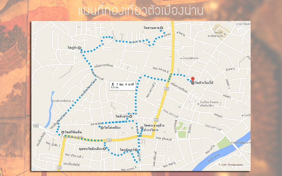 นี่เป็นแผนที่ท่องเที่ยวในตัวเมืองน่าน จุดเด่นก็คงต้องเป็นวัดต่างๆ ที่สวยงาม