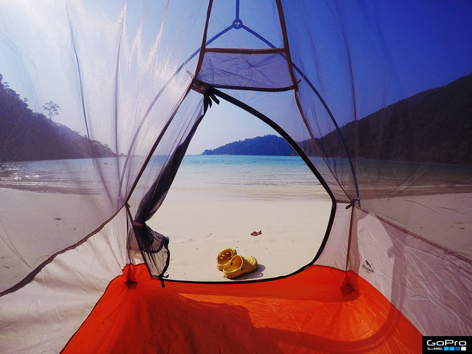 ในเช้าวันใหม่ ตื่นมาเจอภาพนี้ตรงหน้า ที่พักหลักร้อย วิวหลักล้านนน ลมเย็นพัดเข้าเต็นท์ตลอด เสียงทะเลเพราะกว่าที่เคย ในที่สุดก็มีประสบการณ์นอนติดเกาะบนทะเลอันดามันแล้ว คุ้มที่ขับรถมา 930 km. จาก กทม.-เขาหลัก-คุระบุรี ภาพนี้ใช้กล้องGoPro Hero4 ถ่าย เลนสมันกว้างเก็บครบบบ