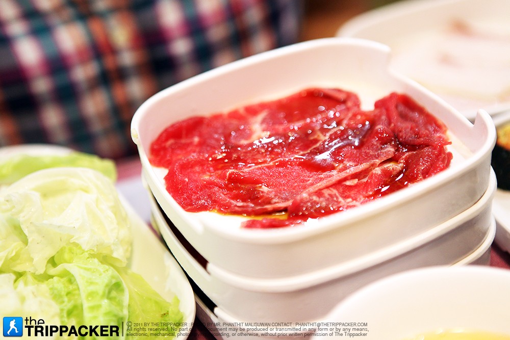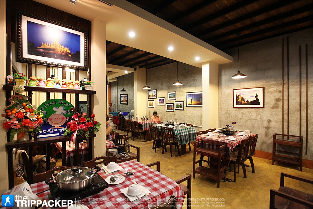 หลังจากที่เราได้รับคำแนะนำ พร้อมคำบรรยายถึงความต่างของสุกี้ร้านดังในเมืองหนองคาย เราก็ไม่รีรอให้เสียเวลานาน มื้อเย็นวันนี้เลยฝากท้องไว้ที่ “เวียงจันทน์สุกี้” ร้านเล็กๆ 1 คูหา สไตล์ปูนเปลือยดิบๆ แต่แอบเก๋ด้วยการนำผ้าขาวม้าสีสดมาใช้เป็นผ้าปูโต๊ะ ซึ่งช่วยลดทอนความทื่อจากสีเท่าของปูนเปลือย แต่ที่สะดุดตาเรามากกว่านั้นก็คือ ภาพถ่ายสวยๆ ของเมืองหนองคายที่ถูกอัดใส่กรอบ แขวนโชว์ไว้เต็มกำแพง จนเราอดเดินเข้าไปชื่นชมใกล้ๆ ไม่ได้ รู้ตัวอีกทีก็เมื่อได้ยินเสียงต้อนรับจากพนักงานในร้าน ถึงนึกขึ้นได้ว่าเราไม่ได้อยู่ในแกลลอรี่หรืองานแสดงภาพใดๆ ทั้งนั้น เท่านั้นแหละครับ เราเลยแก้เขินกันด้วยการตั้งอกตั้งใจเลือกสั่งสารพัดเครื่องสุกี้กันยกใหญ่