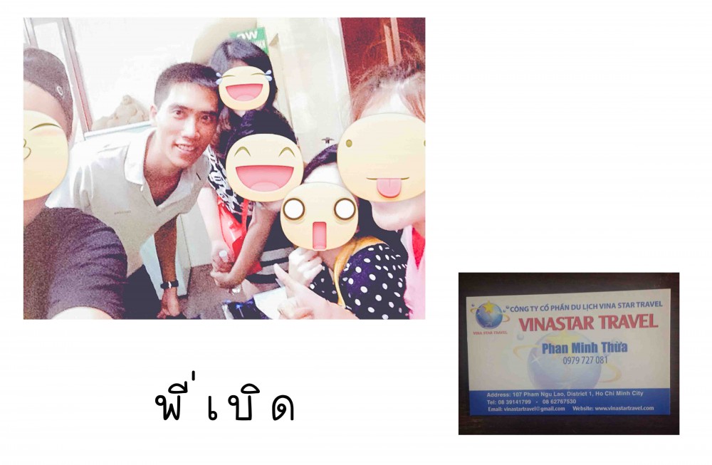ก่อนที่จะเริ่มทัวร์วันที่สอง ผมขอแนะนำฮีโร่ ชาวเวียดนามคนนี้ครับ ขอเรียก นามสมมติว่า พี่เบิด ล่ะกัน ที่มาของชื่อพี่เบิดคือ พี่คนนี้จะพูดอังกฤษสำเนียงแปลกๆ ซึ่งคำที่พวกเราฟังแล้ว หันมองหน้ากันคือคำว่า เบิด สเตชั่น(Bus Station) , สลีฟ เบิด(Sleep Bus) พี่เบิดเป็นบริษัททัวร์ ที่พวกเราได้ลองเสี่ยง ในการซื้อทัวร์ครั้งนี้ ตอนนั้นก็ไม่รู้จะหมู่ หรือ จ่า จะโดนหลอกหรือเปล่าไม่รู้ ด้วยที่เราไปกัน 5 คน ความกลัวก็มาทีหลัง เลยเป็นจุดเริ่มต้นของความประทับใจ อย่างไม่มีวันลืมของทริปนี้ มีการต้อนรับอย่างดีถึงจุดหมายด้วยความราบรื่น ความทรงจำของทัวร์พี่เบิด ได้เกิดขึ้น
