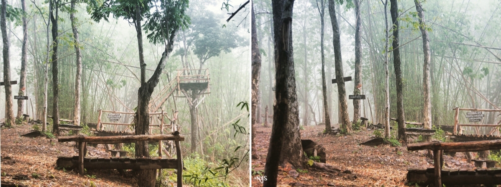 บรรยากาศมีไอหมอกจางๆปกคลุมภูเขา โอโซนบนยอด สดชื่น อากาศค่อนข้างเย็นสบาย หลังจากดื่มเครื่องกันเสร็จพี่ไกด์ก็ใจดีทำของเล่นใบพัดจากต้นไม้แถวนั้นมาให้ สามารถหมุนได้ด้วย หลังจากนั้นเราก็สูดอากาศกันเต็มที่แล้ว ได้เวลาลงไปทานข้าวเช้ากัน ฝนก็ตกลงมาแรกมากทำให้เราไม่สามารถลงไปได้เลย เพราะไม่ได้เตรียมเสื้อกันฝนกันมา พวกเราเลยรอให้ฝนหยุดหรือซาลงก่อนค่อยลงไป