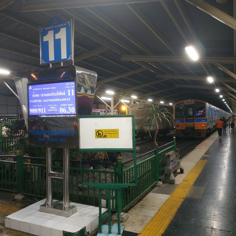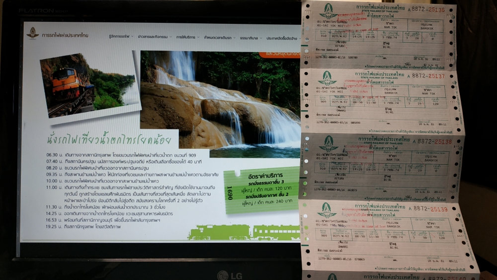 วันเดินทาง แต่ละคนตาห้อยมาเลย เพราะต้องปั่นงานกันจนตี2 ตี3 ต้องมาสถานีกรุงเทพ(หัวลำโพง)กัน 6โมงเช้า กลายเป็นแก้งค์นอนน้อยไปเลย แต่สู้ๆ พร้อมหน้าพร้อมตากันแล้ว ก็ขึ้นรถไปหาที่นั่ง จัดการโน่นนี่นั่น ก็ได้เวลารถออก 6.30น.วันนี้ขบวน ยาวมาก ไปกาญฯ5คัน ไปหัวหิน4คันแวะที่แรก นครปฐม 40นาที  ไม่รอช้า มุงหน้าไปร้านโปรด โชกุน ข้าวเหนียวหมู-เนื้อ หลังสถานี จัดไปคนละ2ห่อ3ห่อหมู-เนื้อกำลังดี กินกับ ข้าเหนียวนุ่มๆ มันช่างดีอ่ะ แล้วเดินต่อไปที่สะพานถ่ายรูปนิดหน่อย ไปไม่ถึงองค์เจดีย์ กลัวกลับไม่ทัน เดินกลับมาที่รถ ก็ได้ของติดมือมาอีกเพียบ น่ากินทั้งนั้น บนรถ ยังมีเตี๋ยวแห้งมาอีก ช้าอยู่ใย จัดอีกครับ ลำบากเลยทีนี้ไม่มีโต๊ะ ถือๆหิ้วๆ กินไปตามอัตภาพ 555เดินทางต่อ คราวนี้ยาว ไปยันสะพานข้ามแม่น้ำแควเลย สัก ชั่วโมงก็ถึง ลงไปถ่ายรูปหน่อยต่อครับยาวไปๆ ประมาณชั่วโมงครึ่ง ก็จะภึงจุดไฮไลท์ของเส้นทาง ช่าวสะพานมรณะ หรือ สถานีถ้ำกระแซ รถจะค่อยๆไป ให้เราได้ดูบรรบากาศ ได้ลูบหินอธิฐาน(ลูบมาแปะหน้าผาก อย่าเอาหน้าผากไปแปะหิน นายตรวจเค้าบอกไว้)และก็กลัวจะชนนักท่องเที่ยวที่เดินบนสะพาน 55 แล้วก็ไปต่อ ชมวิวกันไปเรื่อยๆ จนสถานีน้ำตก ต่อไป สถานีไทรโยคเราไม่เล่นน้ำตก ก็เลยลงมารอรถสองแถวจะกลับไปถ้ำกระแซ โดยไปขึ้นรถไฟ ขบวน258ที่สถานีน้ำตก ถามคนแถวนั้นบอกคนละ 20 แล้วให้รอที่ป้ายรถ หลังคาเขียว(รูปจากกูเกิลเมพ) ก็รอไปคับ ไกล้ได้เวลารถก็ไม่มา พอดีป้าคนนึงเดินมาถามใครไปมั่งตามมา แกพาขึ้นรถ2แถว แล้วไปยังสถานีน้ำตก รอดตายหวุดหวิด พอไปถึงสักพัก ซื้อตั๋ว(คนไทยคนละ4บาท ต่างชาติเหมาเที่ยวละ100) แล้วขบวน 257 เข้าสถานี สลับหัวไปท้ายกลายเป็น 258 เราก็ขึ้นไปจับจองที่สบายๆ โล่งๆ นั่งชมวิวสักพัก บ่ายโมงนิดๆก็ถึงสถานีถ้ำกระแซส่งเราแล้ว 258 ก็ไปต่อ รับนักท่องเที่ยวไปชมสะพานมรณะ ส่วนเราก็มาหาไรกิน เจอร้านเด็ด วิวดี รสชาดใช้ได้ ร้านอาหารถ้ำกระแซ "ใกล้ถ้ำ...ติดแม่น้ำ" เราไปสั่งเป็นกับข้าว กับ5อย่าง ข้าวโถ น้ำเปล่าขวดใหญ่ 835บาท โอเค4คนกินไม่หมดอ่ะ อิ่มเสร็จก็ไปเดินย่อย ไปไหว้พระในถ้ำ ถ่ายรูปบนสะพาน เดินซื้อของชิลๆ รอรถมารับบ่าย3 รถไฟของเราก็มาถึงกลับขึ้นไปประจำที่นั่งของเรา จากนั้นรถจะมาจอดที่สถานีท่ากิเลน มีชาวบ้านเอาของมาขาย มีน้ำชงแก้วละ20 เติมได้ตลอด เด็ดๆก็อัญชัน ใส่น้ำมะนาว และหลากหลายรสให้เลือก แล้วก็ไปต่อยังสถานีกาญจนบุรี ให้ไปดูสุสานทหารพันธมิตร แต่เราไม่เดิน วนไปมาในสถานนีแหละจากตรงนี้ ของฝากที่เราสั่งไว้ก็เริ่มทยอยมา เป็ย่างเกลือมาก่อน ต