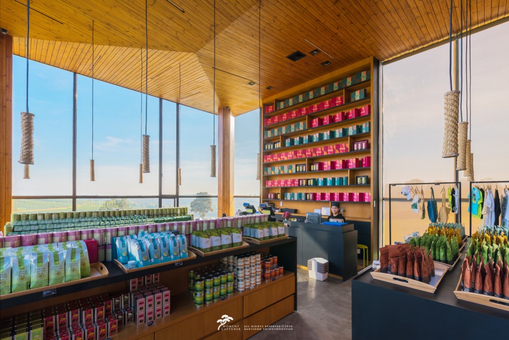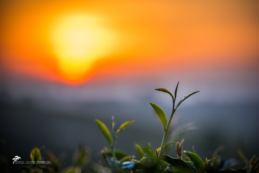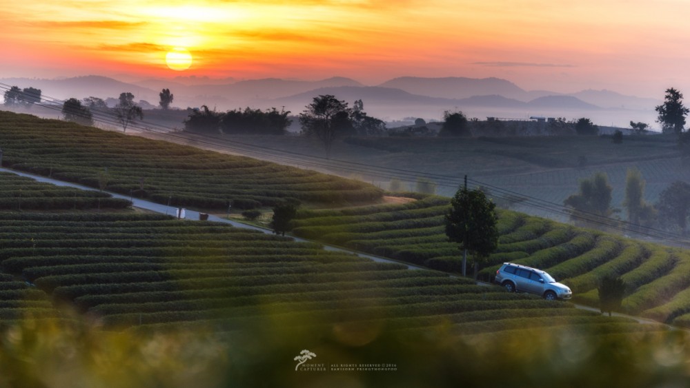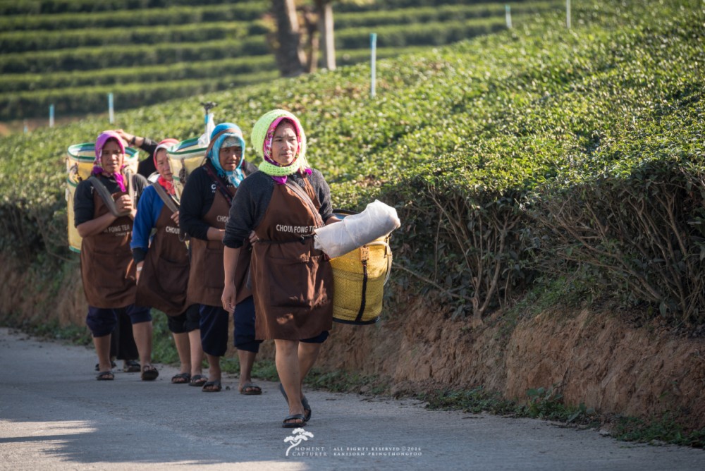 เมื่อเดินเข้าสู่ไร่ชา ภาพใบชาที่เปียกด้วยน้ำค้างดูระยิบระยับเมื่อสะท้อนแสง ละอองน้ำที่ฟุ้งกระจายจากสปริงเกอร์ทั่วทั้งไร่ชาช่วยเติมม่านหมอกให้บรรยากาศดูชวนฝันยิ่งขึ้น วิวที่เห็นทำให้เหม่อมองอยู่นานกว่าจะตั้งสติมาถ่ายภาพได้