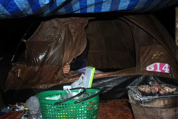 รู้อีกทีก็หมด 2 กลมละ กำลังจะต่อ 3 เหมือนว่าจะมีฝนปรอยๆ ซักพักกระหน่ำเลยจ้ะ  มีเสียงตะโกนว่า "ฝนมา!!!!!!!!" เท่านั้นแหละวงแตก หนีใครหนีมัน เก็บของก็ไม่ทันแหกปากโวยวาย แต่ละคนเตรียมแผนสองกันดีมาก (ตกลงกันไว้ตั้งแต่บ่ายว่า ถ้าฝนมาแผนสองนะ เข้าเต้นท์ใครเต้นท์มัน 55) ดูสถานการณ์ซักพัก ลมแรงขึ้นเรื่อยๆตอนนี้เต้นท์โยกแล้วววว จะปลิวม๊ายยยยยย พยายามประคองกันสุดชีวิต อีกหลังก็ดูท่าจะไม่ไหว อะไรกันเนี่ย  กลางวันเจอฝน กลางคืนลมพายุฝนพัดเต้นท์ปลิว มันสุดๆไปเลยทริปนี้ แม้พวกเราจะพยายามฝืนประคองด้วยการรวมตัวไปอัดอยู่ในเต้นท์เดียวแต่ก็ไม่สามารถต้านทานแรงพายุได้ ขณะที่เต้นท์อื่นๆเค้าได้สละกันหนีตายกันไปหมดแล้ว จวบจนเมื่อเต้นท์อีหลังได้ยุบตัวลงมา ลงความเห็นว่าไม่ไหวว่ะ สละเต้นท์โว้ยยยยย!!!
