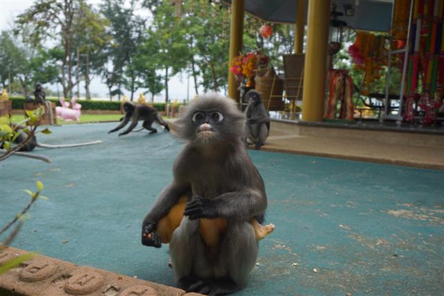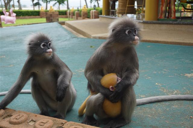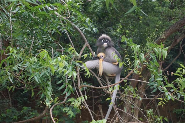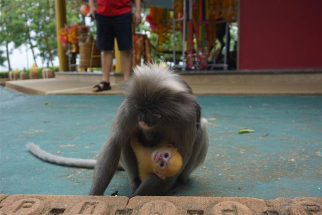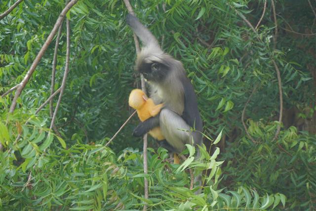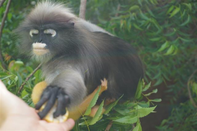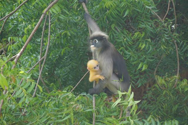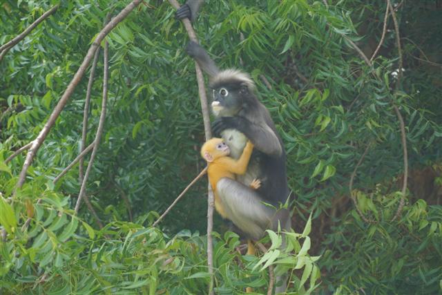 ทริปตามหาค่างแว่นได้มีโอกาสไปทั้งสองเดือนคือ ทริปแรกต้นเดือน กค. ทริปที่สองต้นเดือน สค. เจอค่างแว่นตัวน้อยขนสีทอง น่ารักหน้าตาแบ้วมาก แม่ก็กอดลูกไม่ห่างเลยหวงลูกมากแต่ก็ไม่ได้ก้าวร้าวนะ พยายามจะถ่ายลูกแต่แม่แย่งซีนตลอดเลยเอาหน้าลูกซบที่อกแม่ตลอด ค่างแว่นตอนเด็กจะมีขนสีทองผ่านไปประมาณสามเดือนขนจะเริ่มเปลี่ยนเป็นสีเทาเหมือนแม่ ประมาณ มค.-มีค. ข้อมูลที่ได้มาบอกว่าเป็นช่วงที่จะเห็นลูกค่างแว่นเยอะกว่าเดือนอื่น ทริปที่ไปทั้งสองเดือนคือ กค. และ สค. ไปสองครั้งเห็นแม่ลูกคู่เดียว แต่ก็คนละคู่นะ ค่างแว่นมีนิสัยเรียบร้อยกว่าลิงเวลารับอาหารจากมือเหมือนคนเลย ขอกระซิบบอกว่ามือค่างแว่นนุ้มนุ่มแอบจับมือค่างแว่นตอนให้อาหาร..