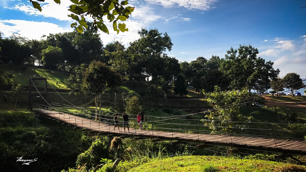 หลังจากถ่ายรูปเล่นสักพักก็เริ่มหิวละ เลยเดินไปสั่งข้าวต้มที่ร้านค้าของอุทยานกิน เบิ้ล 2 ถ้วยเลยครับ หิวมาก ฮ่าๆๆๆ กินเสร็จแล้วกลับมาที่เต๊นท์ อ้าวพี่เต๊นท์ข้างๆ เก็บของไปแล้วครับ ผมเลยเดินไปอาบน้ำ แต่งตัว แล้วก็ไปเดินเล่นรอบๆอุทยาน เก็บภาพ ก็ไปเจอสะพานแขวนของอุทยาน สวย และน่ารักมาก (คนกลัวกความสูงอาจเสียวได้) แดดดี ถ่ายรูปเล่นตามระเบียบ เนื่องจากเป็นสะพานแขวน ผมก็เลยวานเด็กๆแถวนั้นที่มาถ่ายรูปเช่นกันถ่ายให้ครับ เพราะตั้งกล้องไม่ได้ ฮ่าๆๆๆๆ (ขอบคุณน้องสุดหล่อด้วย)