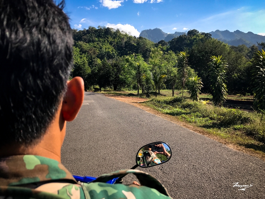 ผมก็เดินเอาเบาะรองนอนไปคืนกลับเจ้าหน้าที่ และรอรับบัตรประชาชนคืน ประมาณ 09.00 น. ระหว่างนั้นผมก็พูดคุยกับเจ้าหน้าที่อีกครั้ง หรือจะเรียกว่าอ้อนวอนก็ได้ว่าขอขึ้นเขาสันหนอกวัวได้ไหม ฮ่าๆๆๆ วันนี้มีคนสละสิทธิ์ไหม ผมจะขอขึ้นแทน แต่ก็ไม่มีผลเหมือนเดิม แป่ววว ไม่เป็นไรครับ ผมขอบคุณเจ้าหน้าที่ แทบทุกคนที่เดินผ่าน ทุกคนเป็นกันเองมากคับ แล้วผมก็เดินออกจากจุดชมวิวป้อมปี่ เดินไปสักแปป พี่เจ้าหน้าที่ขี่รถมอเตอร์ไซด์มาพอดีเลยรับผมไปส่งปากทางเข้าเหมือนเดิม สบายอีกแล้ว พอลงรถพี่เขาถามว่าไปไหนต่อ ผมบอกไปสะพาญมอญครับ พี่เขาเลยแนะนำว่าให้โบกรถนักท่องเที่ยวไปด้วยเลย รอเมล์แดงมันจะนาน ผมเลยขอบคุณพี่เขาอีกรอบ และถ่ายรูปไว้อีกหนึ่งแชะ