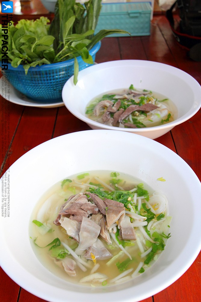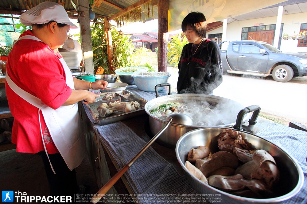 และเมื่อชามแรกมาถึง เราจึงได้โอกาสถามป้าบัวหวานว่า “ข้าวปุ้นน้ำแจ่ว เมนูยอดนิยมชนิดนี้คืออะไร” ซึ่งป้าบัวหวานได้ยิ้มให้เราและอธิบายให้ฟังอย่างเป็นกันเองว่า “จริงๆ แล้วข้าวปุ้นน้ำแจ่วก็คือ ขนมจีนน้ำใสที่ได้สูตรข้ามน้ำข้ามโขงมาจากฝั่งลาว ซึ่ง “ข้าวปุ้น” ก็คือขนมจีน แต่เส้นจะเล็กกว่า ส่วน “น้ำแจ่ว” ก็คือน้ำพริกของชาวอีสาน หรือพูดง่ายๆ ก็คือ ขนมจีนในต้มแซบเครื่องในหมูนั่นเอง แต่ส่วนประกอบของข้าวปุ้นน้ำแจ่วที่แตกต่างจากขนมจีนทั่วไปก็คือ จะมีเครื่องในหมูที่ต้มจนสุกหอมแล้ว ใส่รวมมากับผักชนิดต่างๆ เช่น ผักบุ้ง กะหล่ำปลี ถั่วฝักยาว ถั่วงอก สาระแหน่ ต้นหอมสด และสิ่งสำคัญที่ขาดไม่ได้เลยก็คือ น้ำชุบใส ซึ่งแต่ละร้านจะมีรสชาติหอมหวานของน้ำต้มกระดูกหมูที่แตกต่างกันออกไปตาม สูตรของตัวเอง และก่อนทานก็แค่ปรุงรสด้วยกะปิกับมะนาว ให้มีรสชาติอมเปรี้ยว อมเค็ม และได้กลิ่นหอมอ่อนๆ ของกะปิเป็นใช้ได้ หรือถ้าใครชอบรสเผ็ด ก็ให้เติมพริกสดตำละเอียดลงไป แต่แนะนำว่าให้ลองใส่แต่น้อยก่อน เพราะพริกที่นี่รสเผ็ดมาก เพียงแค่นี้ก็จะได้ทานข้าวปุ้นน้ำแจ่วรสเลิศแล้ว”