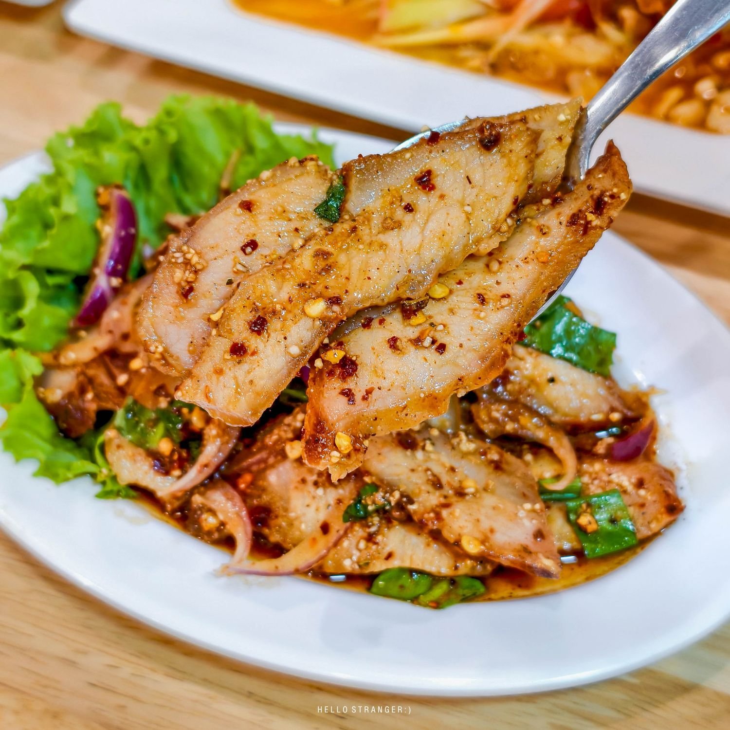 น้ำตกคอหมูย่าง เมนูนี้เราชอบมาก คอหมูย่างชิ้นใหญ่ เนื้อฉ่ำ หอมข้าวคั่ว กินคู่กับข้าวเหนียวร้อนๆ คือฟินเลย
