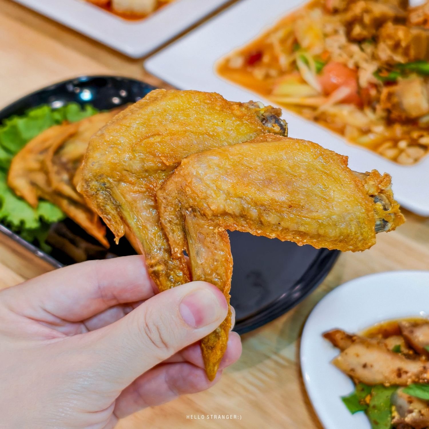 •ปีกไก่ทอดน้ำปลา ไก่ทอดมาแบบกรอบนอกนุ่มใน รสชาติเค็มนิดๆ สั่งมาทานคู่กับเมนูตำคือเข้ากันสุดๆ