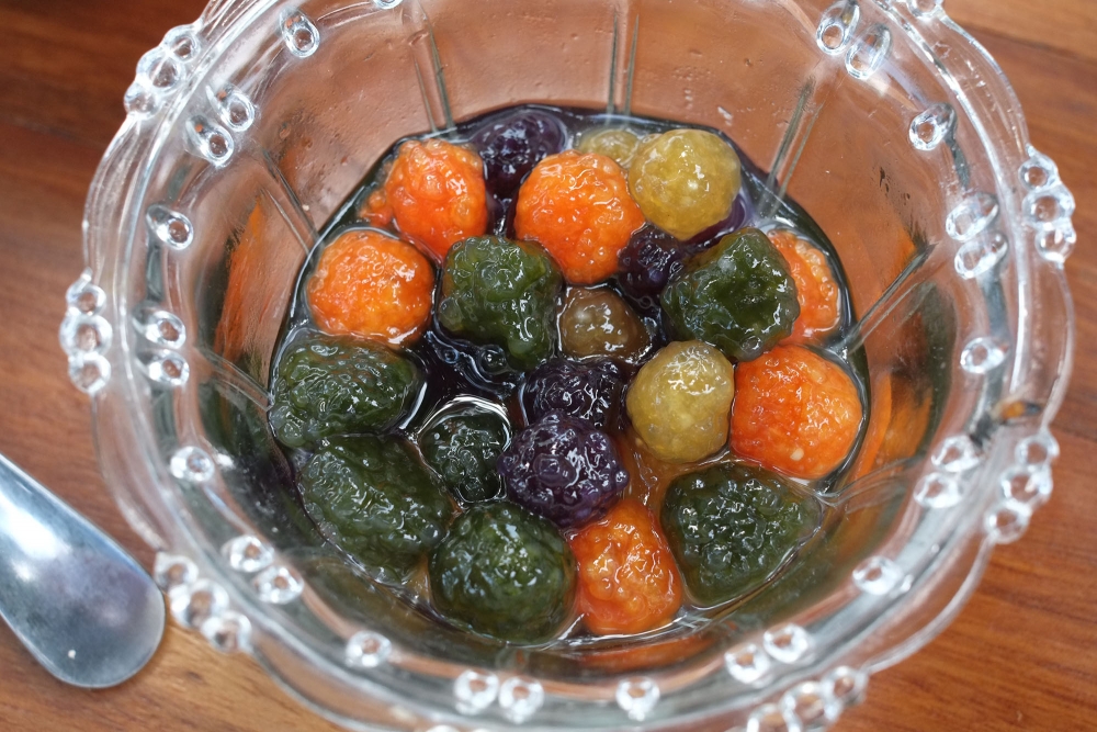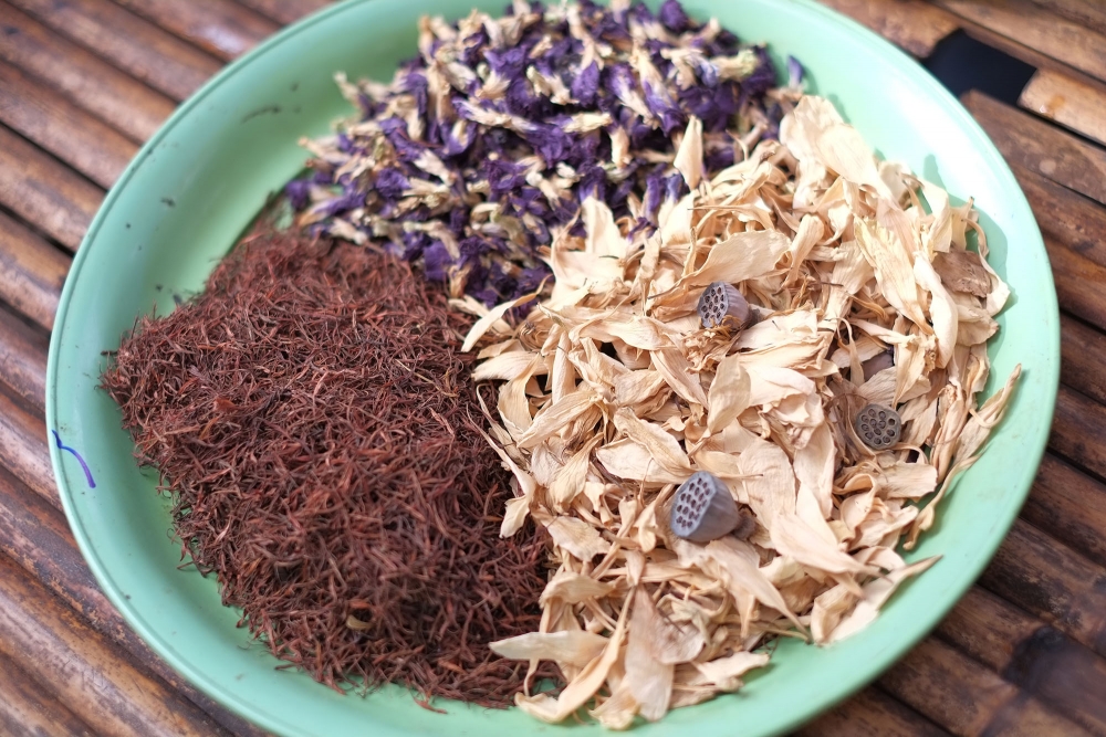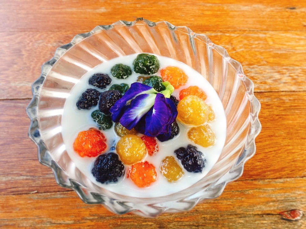 อย่างสีแดงจากไม้ฝาง ม่วงจากอัญชัน และสีเหลืองจากดาวเรือง (เพิ่งรู้นะคะว่าดาวเรืองเอามาทำอาหารได้ด้วย) วิธีการทำก็ง่ายมาก เริ่มจากเทสีต่างๆ ลงในสาคูเพื่อให้ได้สีตามต้องการ