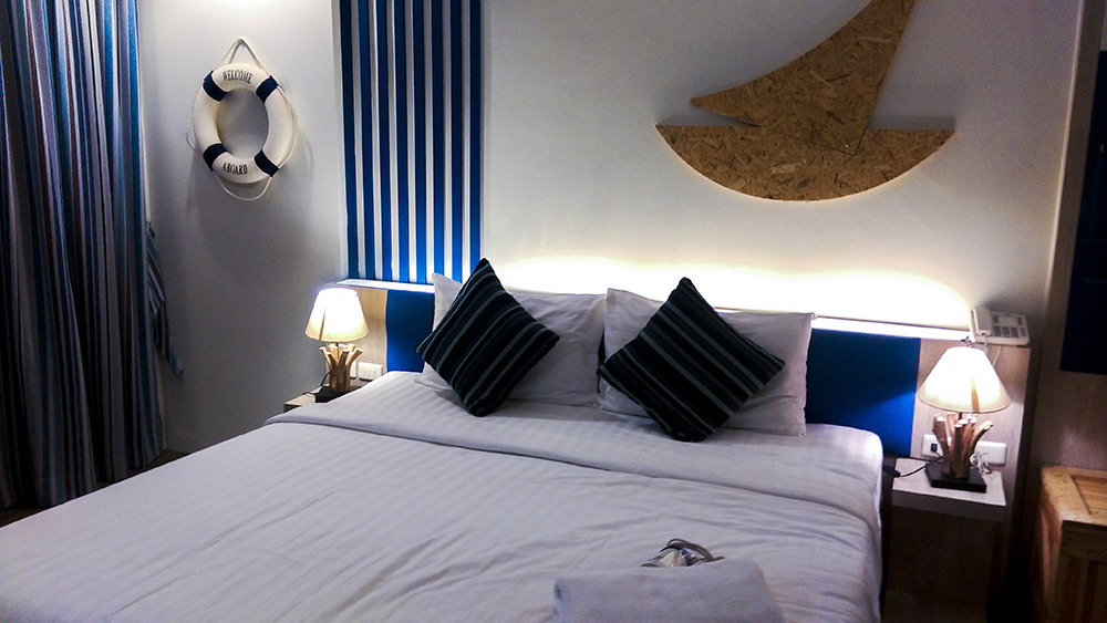 พอมาถึง เปิดประตูเจอลอบบี้เลย โอ้โห แต่งได้เก๋มากจริงๆ โทสีฟ้าๆ บลูๆ ตามชื่อโรงแรมเลย เช็คอินก็แค่ยื่นบัตรประชาชน หากต้องการจะเช่ารถมอเตอร์ไซต์ ก็สามารถบอกพนักงานได้ครับ เขาจะติดต่อให้ ค่าเช่าวันละ 300 บาท ผมสายแว๊นเลยต้องเช่าซะหน่อย รถมอเตอร์ไซต์สภาพดีนะครับ แต่ไม่เติมน้ำมันมาให้ ไปหาเอาดาบหน้าเลย (แถวนั้นไม่มีปั้มน้ำมัน ต้องขี่วนกลับมาทางห้าแยกฉลอง (ซึ่งแพลนผมคือจะไปแหลมพรหมเทพ เลยต้องไปหาเอาดาบหน้าจริงๆ)