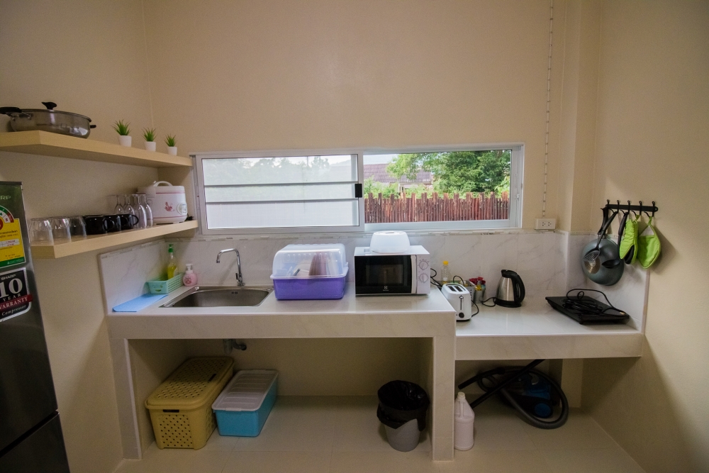 มี 2 ห้องนอน 1 ห้องนั่งเล่น มีห้องครัว และอุปกรณ์ครบ