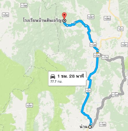 - การเดินทางจากตัวเมืองน่านมายังหมู่บ้านสันเจริญฯ รถทุกชนิดมาได้แบบสบายๆ ระยะทางจากตัวเมืองน่าน – บ.สันเจริญฯ ประมาณ 77 กม. ใครที่วางแผนจะมาเที่ยว สวนยาหลวง สามารถแวะเที่ยวในตัวเมืองน่าน ช่วงเช้าๆ ก่อน และเข้าพื้นที่ บ.สันเจริญฯ ตอนบ่ายๆ เหมือนกลุ่มผมก็ได้ครับ