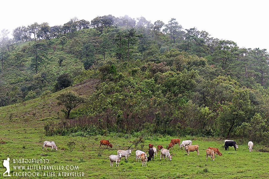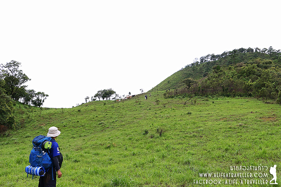 เราปีนป่ายฝ่าหมอกขาวจนถึงเวลาอีกสิบห้านาทีเที่ยงก็มาถึงครึ่งทาง จุดนี้ชื่อว่า “เด่นสะแกง” ได้ยินเสียงกระดิ่งก๊องแก๊งพร้อมวัวฝูงเบ้อเริ่มเดินเล็มหญ้าให้งงเล่นพวกมันว่ามาจากไหน เจ้าหน้าที่บอกว่าเป็นวัวชาวบ้านข้างล่างที่เดินขึ้นมาหากินบนเขา... สุดยอดจริงๆ วัวพวกนี้