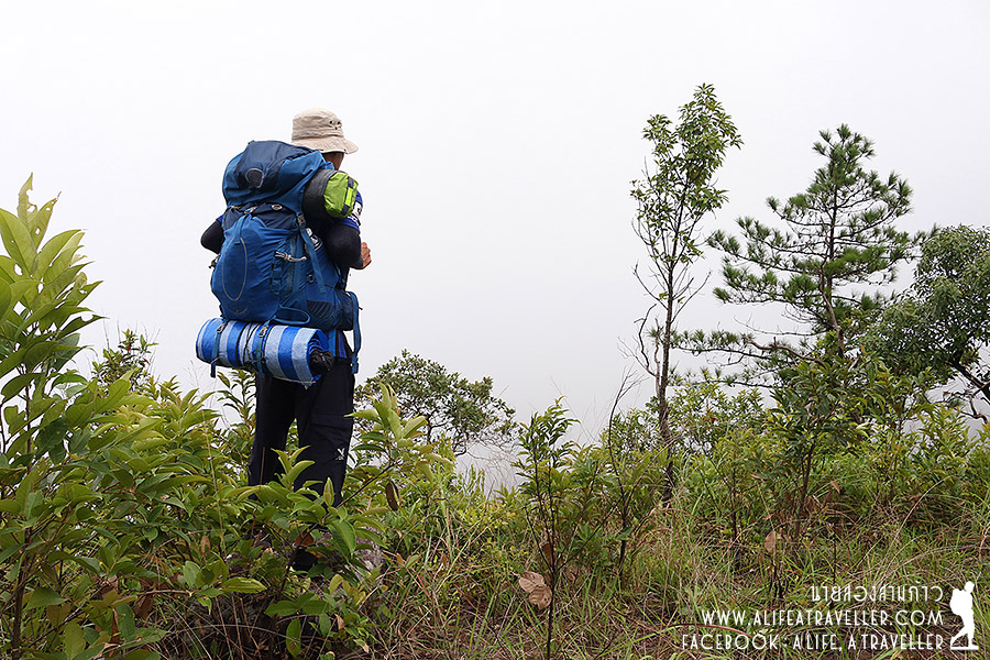 เป้ใบโตถ่วงน้ำหนักชวนให้หงายหลังเหลือเกินแต่สุดท้ายก็ขึ้นมาสำเร็จ ปกติเมื่ออยู่บนสันหมูแม่ด้อง มองฝั่งซ้ายจะเห็นลำปาง ฝั่งขวาคือพะเยา ทว่าของเราเป็นปกติอีกแบบคือหมอกฟุ้งขาวโพลนมองไม่เห็นอะไรสักนิด ลูกหาบแนะนำว่าพยายามทิ้งตัวไปทางขวา เพราะหากพลาดร่วงลงไปจะได้เก็บขึ้นมาง่ายๆ ถ้าตกซ้ายจะลงไปยาวตามเก็บลำบาก (ฮา...)