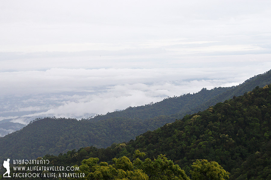 เมื่อพ้นจากบันไดก่ายฟ้า ขุนเขาสูงสุดของพะเยาค่อยๆ ปรากฎตรงหน้า “ดอยหลวง” นั่นไงล่ะ เห็นท่าทีว่ามีโอกาสฟ้าจะเปิดมากขึ้น ผมจึงใจเย็นรอเวลาช่วงหมอกบางพอถ่ายภาพยอดดอยหลวงไกลๆ เก็บมาได้เล็กน้อย มองเห็นเพื่อนร่วมทริปกำลังเดินขึ้นเขาตัวเท่ามด