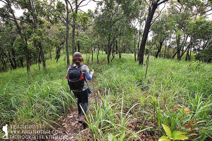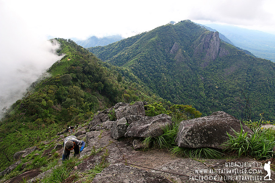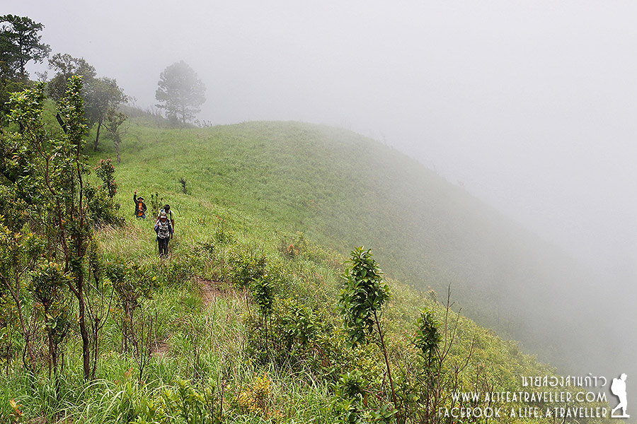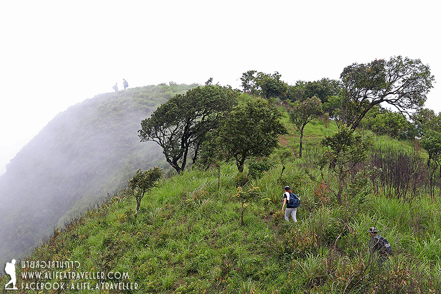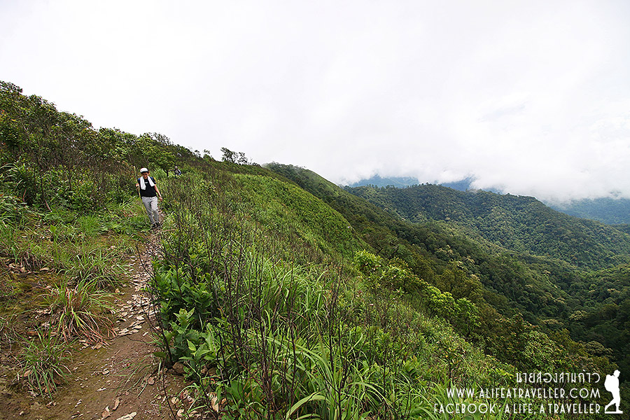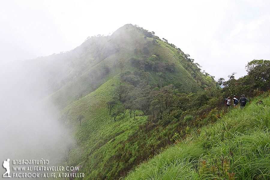 พ้นจากเด่นสะแกง เรามาเดินบนทางเลาะสันเขา แม้แอบเสียดายว่าฟ้ายังเปิดไม่เต็มที่ทำให้ไม่เห็นวิวข้างล่าง แต่อีกใจหนึ่งกลับยิ้มลึกๆ เพราะภาพหมอกขาวคลอเคลียกับป่าสีเขียวให้ความรู้สึกยอดเยี่ยมไม่น้อยไปกว่ากัน