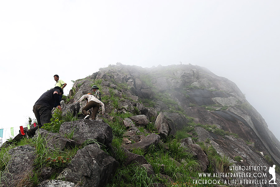 สี่โมงครึ่งเรามาถึงตีนทางขึ้นดอยหนอก วางสัมภาระทิ้งไว้แล้วลุยกันเลย ขอบอกครับว่าคนเป็นโรคกลัวความสูงมีขาสั่นแน่นอนเพราะทางปีนป่ายชันมาก ดีว่าหินไม่ลื่นรองเท้าเกาะหนึบใช้ได้