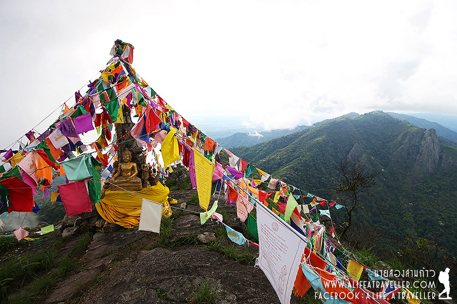 จุดนี้มองมองเห็นผาหินอยู่เขาลูกถัดไป ลูกหาบบอกว่าชื่อผาสามเส้า อาจมีการทำเส้นทางให้เดินไปพิชิตในอนาคต ส่วนด้านล่างเห็นพระพุทธรูปสีทองประดิษฐานอยู่ นั่นคือบริเวณที่เราจะค้างแรม